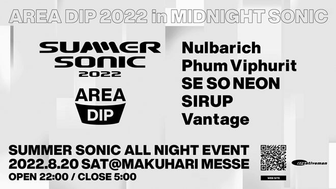 また、AREA DIP始動の発表に伴い、Nulbarichのボーカル兼プロデューサーであるJQをキュレーターに迎え、<SUMMER SONIC>内でクラブイベント<AREA DIP 2022 in MIDNIGHT SONIC>を、8月20日に千葉・幕張メッセにて開催することも発表された。イベントは<SUMMER SONIC>初日にあたる20日22:00から行われ、Nulbarichを筆頭に、SIRUPや、タイのシンガーソングライター Phum Viphurit(プム・ヴィプリット)、韓国の3ピースバンドSE SO NEON(セソニョン)、フューチャーファンクの第一人者でもあるVantageなどがラインナップされている。なお、<AREA DIP 2022 in MIDNIGHT SONIC>は、<SUMMER SONIC>東京2DAYチケットもしくは<SUMMER SONIC>東京8月20日(土)または21日(日)1DAYチケット・プラチナチケットで入場が可能ということ。詳細は、オフィシャルSNSなどからチェックを。