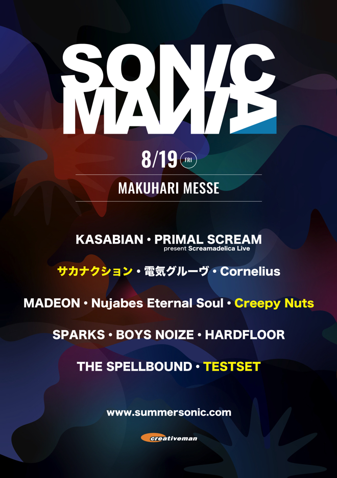 <SONICMANIA>は<SUMMER SONIC>の前日に開催されているオールナイトフェス。今回の発表では、サカナクションとCreepy Nuts、TESTSETの3組の出演が明らかになった。