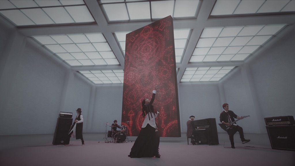 水樹とバンドメンバーのみが存在する白と黒を基調とした無機質な空間で、ロックサウンドをミステリアスな雰囲気を纏いながら熱く歌い上げる今回のMUSIC CLIP。衣装は黒いレザーのロングスカートとショートパンツのアシンメトリーなものになっており、アクセサリーと手袋の“赤”は、作品の主人公“エドワード・エルリック”の赤いコートをイメージしたもの。さらに、中央に置かれた真っ黒な石壁は「鋼の錬金術師」に登場する“真理の扉”をイメージしており、楽曲の後半で壁に赤い錬成陣が浮かび上がるシーンも見どころの一つとなっている。