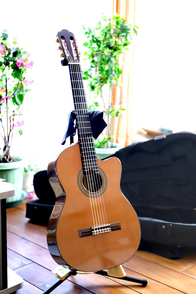 でもネックを握った瞬間、弾きやすそうだとピンと来たんです。音を出したら、何て抜けがよくてまっすぐで透明な音色!そしてふくよかで豊かな倍音、やわらかな気品、低音から高音までのバランスのよさ…、ほんの数秒でこのコしかいない、と虜になってしまいました。