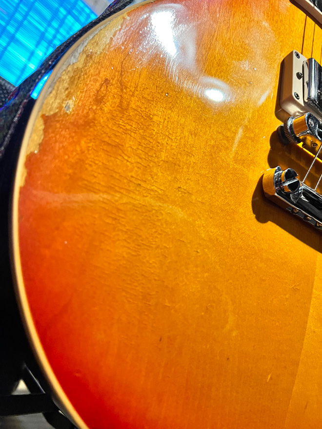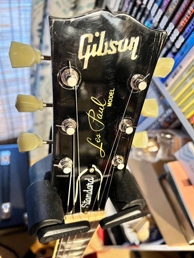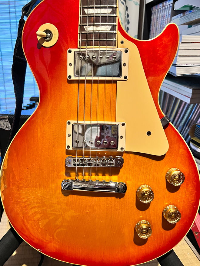 音も最高で、ただのレスポールスタンダードから出ていいトーンを超えてる!って自分では思ってまして、ボディーの塗装剥げ、クラックもとっても渋くて素敵!潔いプレーントップもむしろ味を感じてしまいます。