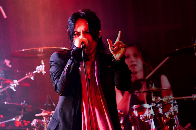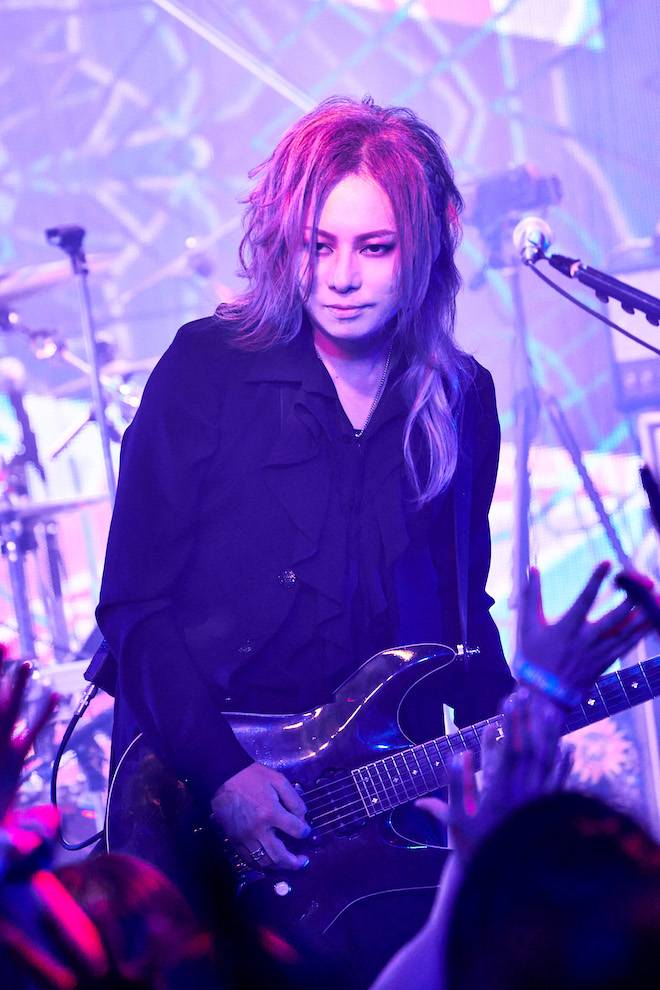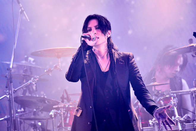 そんな前ふりから始まった「MASQUERADE」。メロディーの合間にフェイクをいれて会場を煽り、MASATO(G)もRYO(B)も生でコーラスをとる。昨今では多くのバンドがコーラスも同期に頼りがちだが、可能な限り生で唄うことで演奏がよりみずみずしいものとなっていることはいうまでもない。MASATOのギターソロに、リズミカルに甘い吐息を添え、1つ1つの歌詞に沿った仕草と目線で表現するTAKA。指先まで神経を行き届かせた所作の美しさは観る者を心酔させるには十分だ。