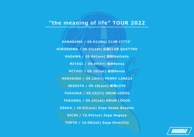 アルバムのリリースに続く形で、9月1日からは全国ツアー<yama ”the meaning of life” TOUR 2022>が開催される。6月2日より同ツアーのチケット先行受付もスタートする。