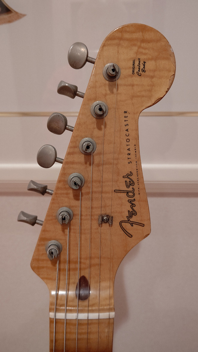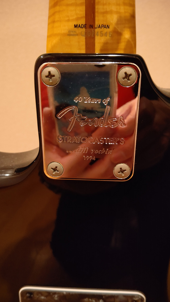 ストラト40周年を記念したフジゲン製のフェンダージャパン・ストラトですね。もちろん1994年製。ストリングガイドがかもめ型なのでアルダーのST57-65ASだと思います。もしパーツ交換してあったらライトアッシュのST54-70ASの可能性もありますけど、そこまでは写真じゃわからないですね。ネックのフレイムは当時の新技術フォトフレームで、ゆらゆらとうごめくわけじゃないですけど大評判でしたよね。(JMN統括編集長 烏丸)
