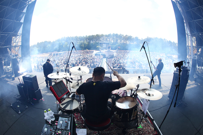 「CROWN」を挟み、ショウは残り2曲となった。ここでAGは澄み渡る青空を見上げて、「突き抜けてんな、今ならどこまでも行けそうな気がする」と言い放ち、「SADVENTURES」に突入。すると、「SATAN STAGE」の端から端までジャンプさせる至福の光景が広がった。大地を揺さぶる演奏に加え、ファルセットヴォーカルや重層的なコーラスワークも心地よく、多彩な攻めで観客を揺らしまくっていた。