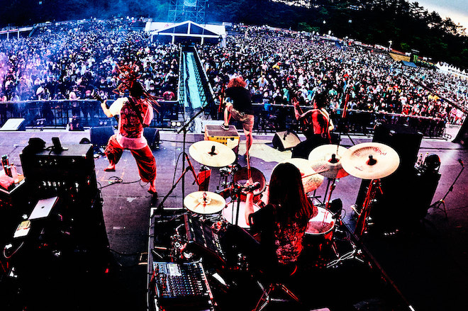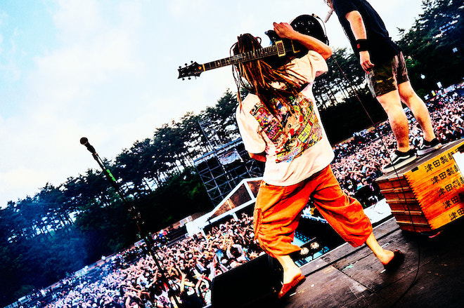 また今回、ダイスケはんも協力している飲食ブース=幡谷再生大学では、愛媛の都市伝説『蛇口をひねるとみかんジュースが出る』というのを再現している。まだ飲んでいない腹ペコ諸君が多かったことを知り、「俺達のライブが終わったら、50杯、俺がおごるわ!」とダイスケはんは大盤振る舞い。「たっぷり汗を流した後は、最高のビタミンが待ってる。飛び跳ねられるか、サタニック!」と「my girl」へ続いた。