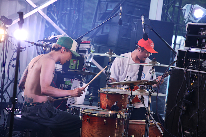 ミッドテンポのオルタナロックナンバー「A FLY (dedicated to RELAX ORIGINAL)」、daipon、Naoki、takumi(Dr, Cho)の演奏が巧みに掛け合う「BOW!!」はもちろん、観客のフィジカルな反応を引き出した「”TH”」「BLESS」といったメロディックハードコアナンバーも日本人特有の泣きの要素は皆無で、ドライだったり、フリーキーだったりするところがおもしろい。