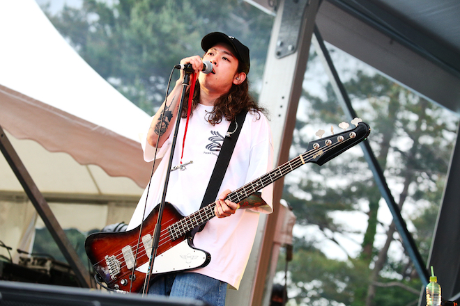 「俺達、この<YON FES>をみんなが1年に1回、帰って来られる場所にしたい」……サウンドチェックが早めに終わったもんだからって、そんなジョークを飛ばしたdaipon(Vo, B)の悪ノリはエスカレート。<YON FES>を主催している04 Limited Sazabysの「buster call」をワンコーラス歌い上げると、なぜかバニーガールがステージに出てきて、踊り出すという謎の展開に。