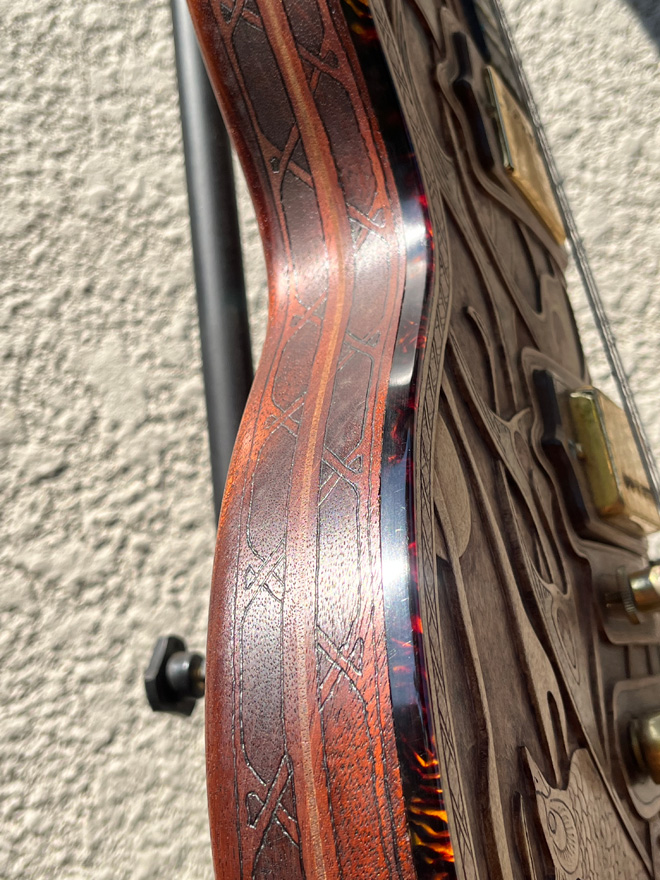 パーツはゴージャス感を出すため(?)ゴールドにこだわってます。ペグはグローバー製。木製エスカッション。ボディのサイドにも彫り物がしてあります。