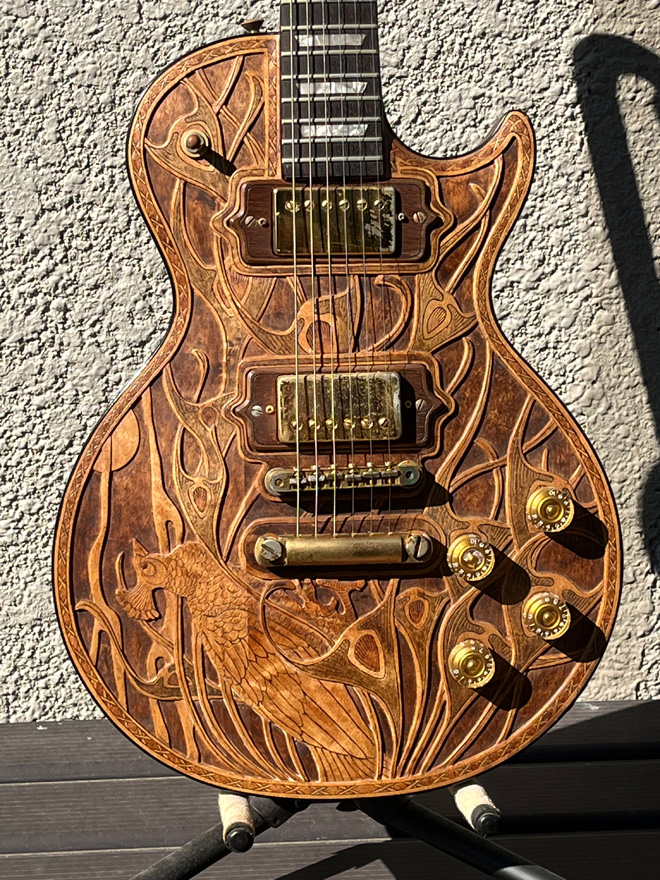 詳細は不明ですが、個人の手作りの1本のようです。シリアル・ナンバーから推察するに70~72年製のLes Paul Standardかと思います。ネック材は3ピース・メイプル。トップ材を剥がし、彫刻を施したトップ材を張り直したようですし、バインディングはベッコウになっています。
