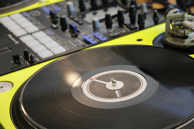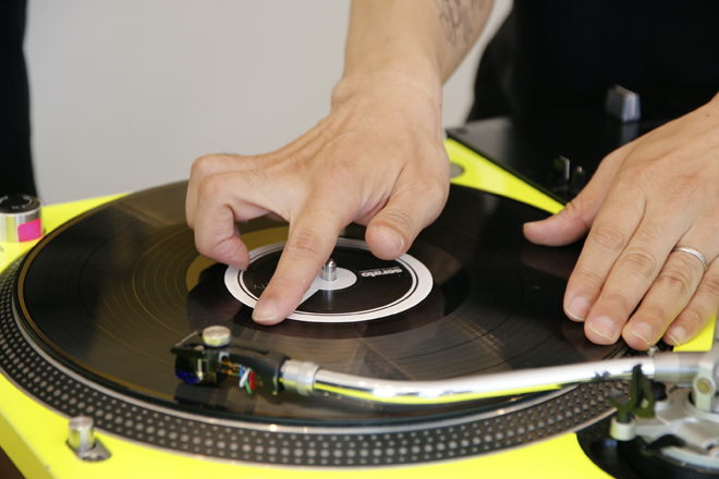 近年のクラブDJでは、ミキサーとPCをつなぎ、ターンテーブルにはコントロールバイナルと呼ばれる専用ディスク(見た目はアナログ盤にそっくり)を置いてDJプレイを行うのが主流なのだそう。細かい解説は省くが、これを使うとPC内のデジタル音源をアナログレコード同様に操ることができるのだ。