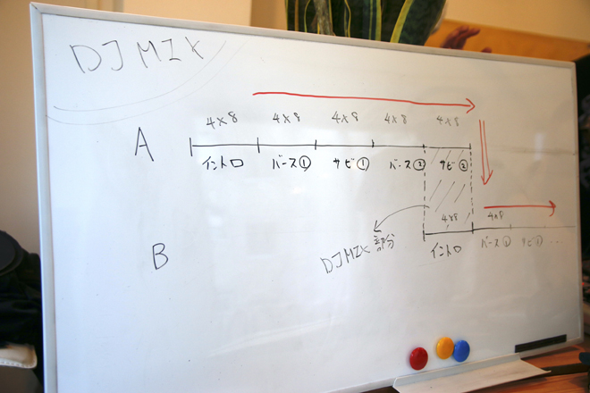 「AとBの2曲をつなげるときに、まずは2つの曲のテンポを合わせます。そして、例えば、Aのサビの終わりでBが歌い出すようにつなぎたい場合、Aのサビの終わり8小節と、Bのイントロ8小節をMIX=同時に流すわけです。これがDJ MIXです」。