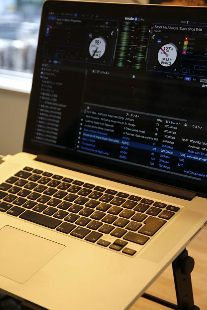 さて、いよいよ実践へ。「AC/DCのTシャツを着ているので、AC/DCの曲を使いましょう」と、AC/DCの代表曲「バック・イン・ブラック」を例題として使うことに。PCでそのBPMを調べると93だったので、同じくBPM93の曲をPCで検索。先生はいろいろな曲を探し出しては、試しにMIXしてみるのだが、これが意外とうまくいかない。