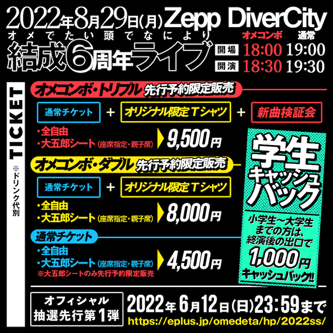 オメでたい頭でなによりが、バンド結成6周年記念日となる8月29日にZepp DiverCity (TOKYO)にて、結成6周年ワンマンライブを開催することが決定した。