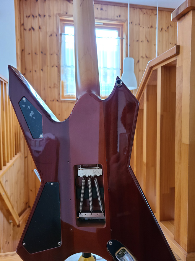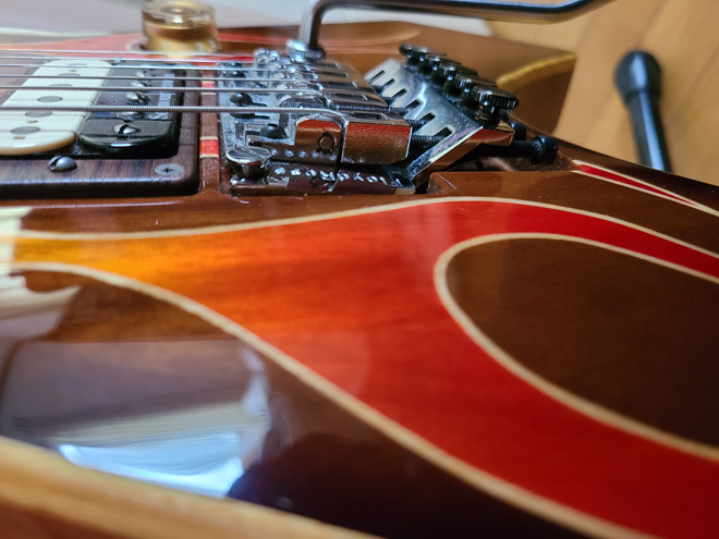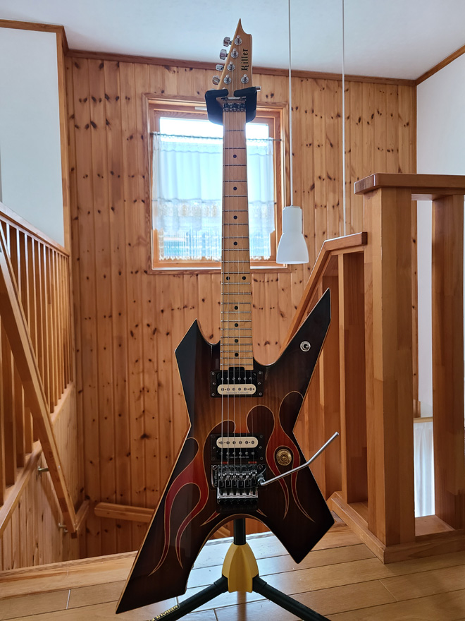 LOUDNESSの高崎晃さんが、このKG-Prime red flame(レッドフレイム)を弾き始めた頃、私はKG-Prime hickory brownを持っていました。その為、拒否的な感情が強くあったのをはっきり覚えています。ところが、月日の経過と共にレッドフレイムが氣になりだし、その想いを止められなくなるのです。