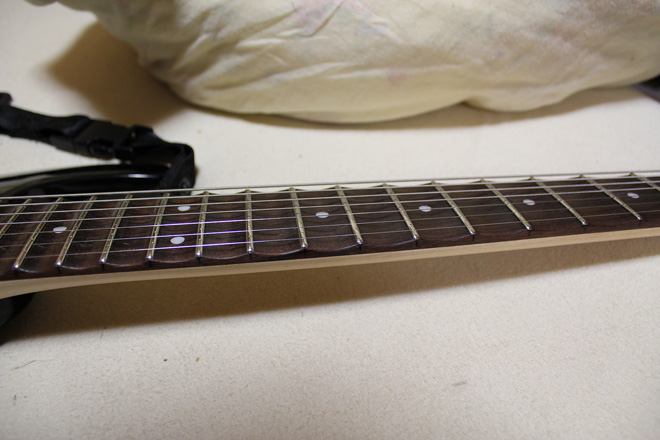 確かに7弦でスキャロップって見たことない。R.ブラックモアやインギー世代と7弦世代がクロスしていないから、このオーダーが稀有なんでしょうね。けど、軽いタッチで確実にフィンガリングできるという意味では、7弦を使用するテクニカルプレイにはピッタリ仕様な気もする。しかしさすがのプロ、スキャロップもフレット処理もお見事に美しいですね。私には凄く弾きやすそうに見えます。(JMN統括編集長 烏丸)