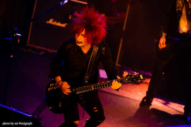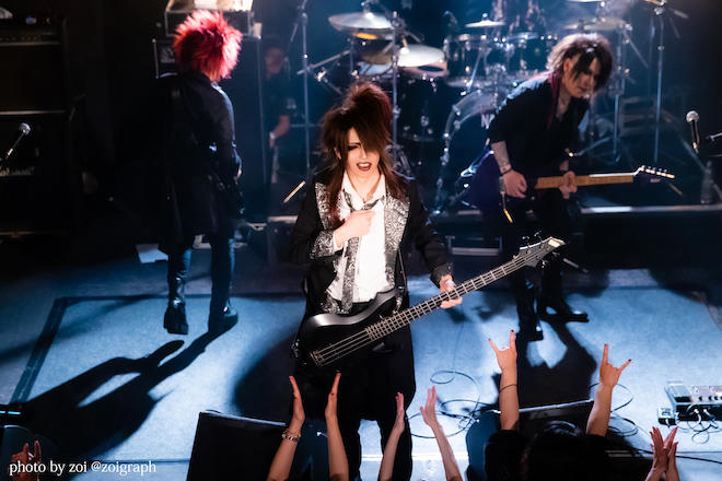 その興奮をさらに滾らせたのが「I.D」。会場は一気に荒々しく、ヘドバンで埋め尽くされる。「そんなもんか?」と言わんばかりに煽るAKIRAを筆頭に、メンバーもそれぞれ前に乗り出していった。KISAKIの奏でるベースは図太く狂気じみた気迫を感じさせる。彼のようにバンドの中で、いや、ライブ全体の中でこんなにも存在感を感じさせるベーシストは希少な存在であろう。久しくステージに立っていなかったKISAKIの音が、一気に放出されると共に感情も大きく投げ出され、会場全体が1つのエネルギーとして揺れ動く──あとは狂い倒すだけだ。