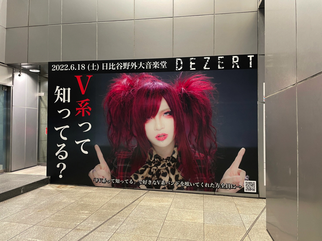 「MAGNET by SHIBUYA109 ビッグボード」に掲出されているこの看板は、トレードマークともいえる赤髪のツインテール姿でポーズをとる千秋(Vo)の姿と「V系って知ってる?」とのメッセージをあしらったもの。ボード下部には“「#V系って知ってる」で好きなV系バンドを呟いてくれた方全員に→”という文字と謎の二次元コードが掲載されており、Twitterでも「#V系って知ってる」がトレンド入りするなど反響を呼んでいる。