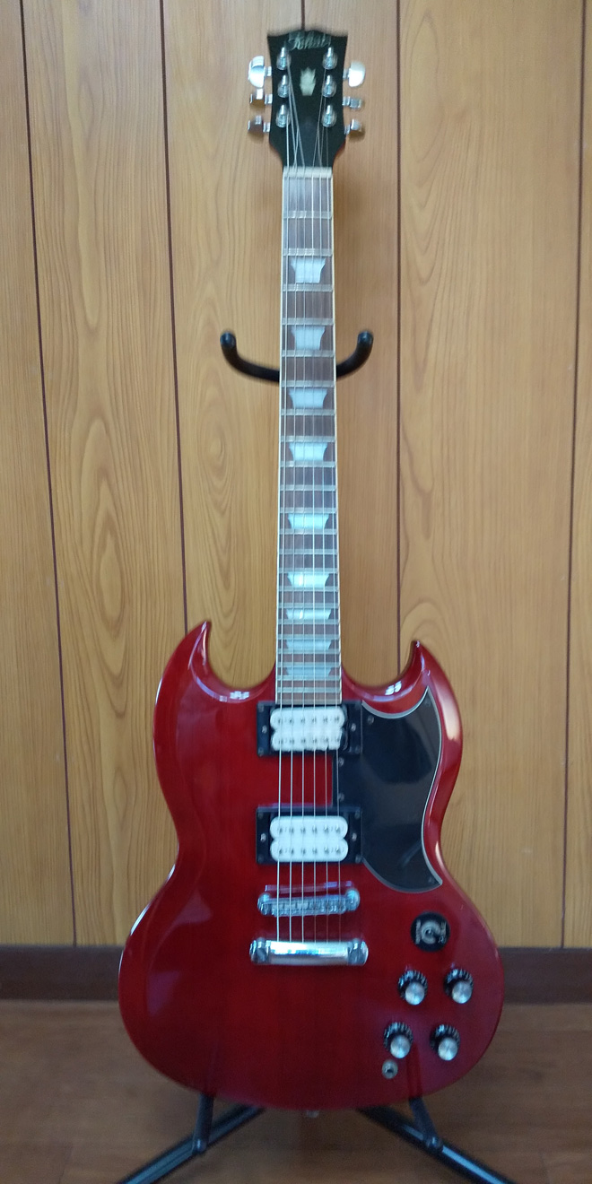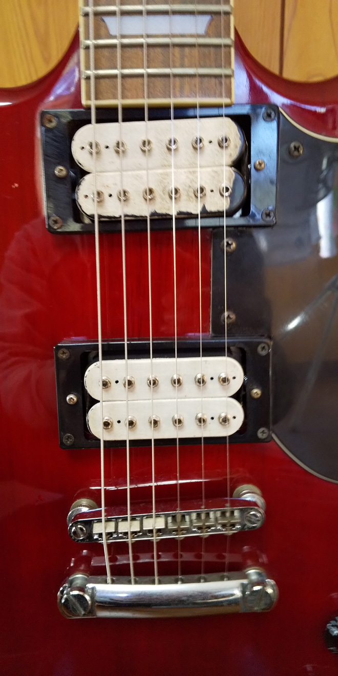 中古で一万二千円で買ったヤツでSGなのにボルトオンで、そのせいかとてもアタックの強い音がします。そこが気にいっているのですが、いかんせん音がコモりぎみ。