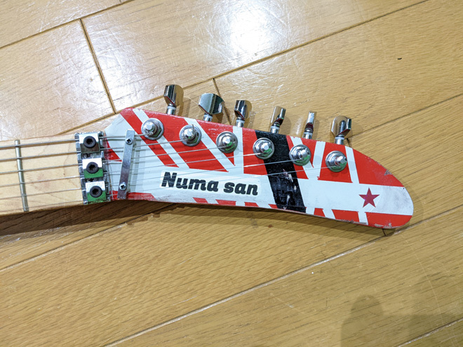 またまた56歳児ぬまさんがやってもた。しかし普通のストラト・タイプからバレッタ・シェイプに魔改造、しかもヘッドまでバナナ風にしているという、相当の手がかかっている力作。しかもまんまフルコピーではなく自分専用にカスタマイズしちゃっているのが素晴らしすぎる。しかもこのギターで、ボズ・スキャッグスに行っちゃうというハズシの美学が粋すぎた。これ、洋楽コーデの抜け感ってやつですか?(JMN統括編集長 烏丸)