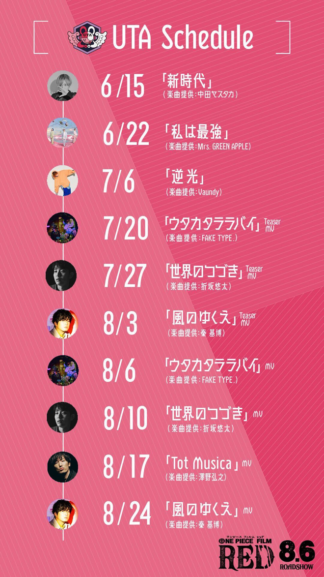 ウタが歌唱する楽曲の制作陣には、本作の音楽も手がける中田ヤスタカをはじめ、Mrs. GREEN APPLE、Vaundy、FAKE TYPE.、澤野弘之、折坂悠太、秦 基博が名を連ねる。8月10日には中田ヤスタカ提供の主題歌「新時代」と劇中歌6曲を収録したCDアルバム『ウタの歌 ONE PIECE FILM RED』がリリースされることも決定。6月15日から順次、各曲のミュージックビデオが公開される予定となっているほか、楽曲にまつわるショートストーリー『ウタ日記』も配信予定とのことだ。