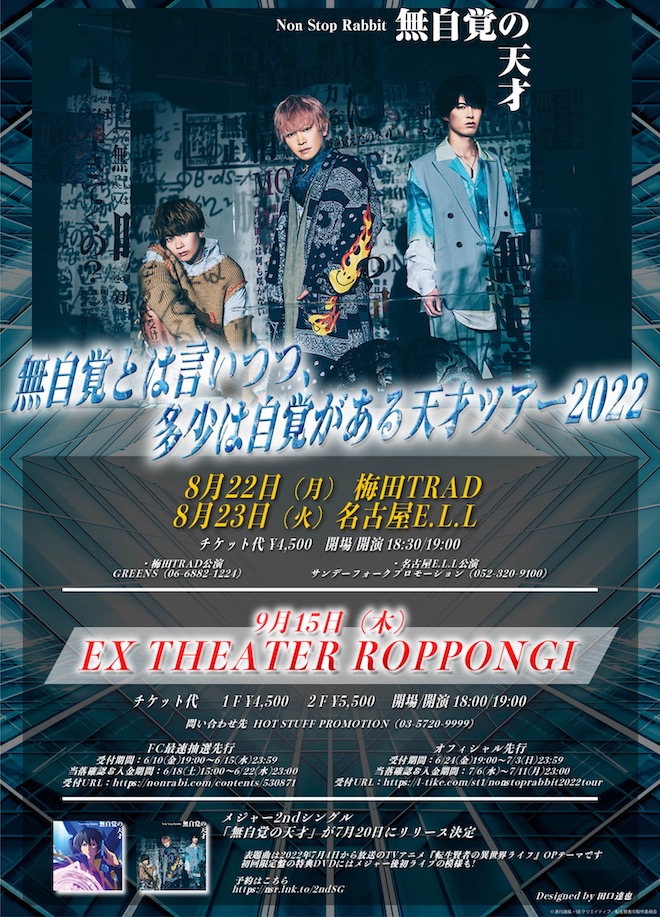 Non Stop Rabbitが、東名阪ツアー<無自覚とは言いつつ多少は自覚がある天才ツアー2022>の開催を発表した。