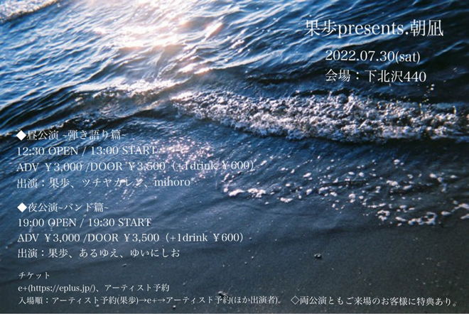 新潟出身シンガーソングライター・果歩が7月30日(土)に下北沢440にて開催する自主企画ライブ<朝凪>のゲスト出演者が発表された。