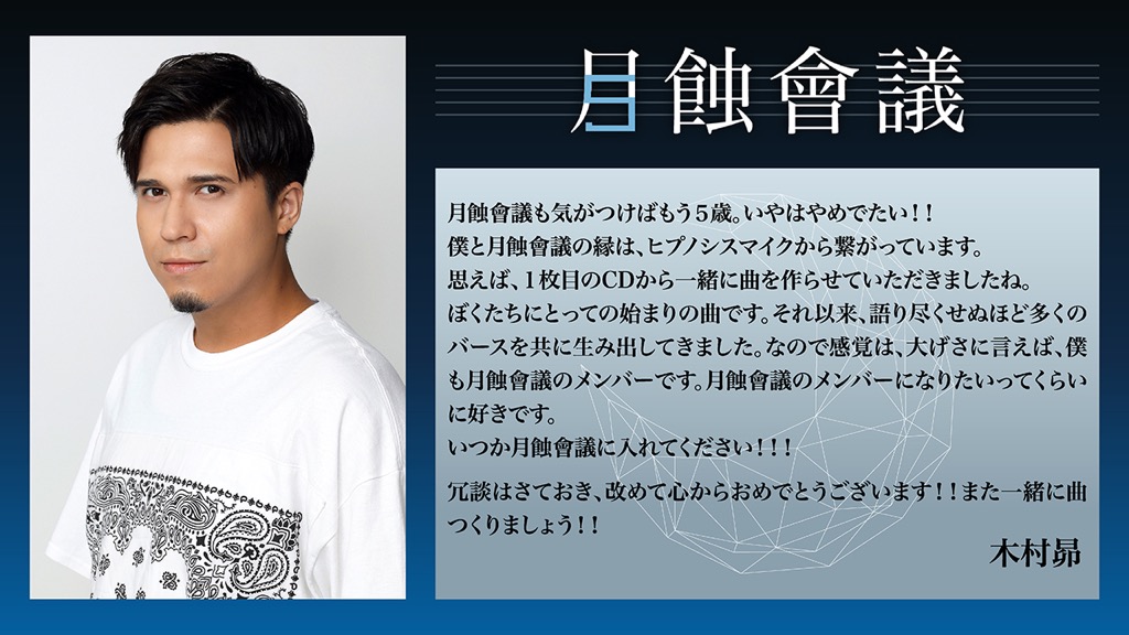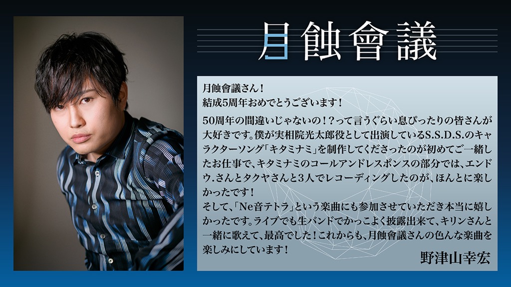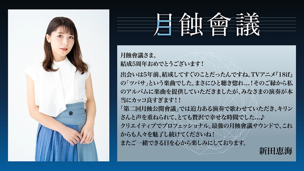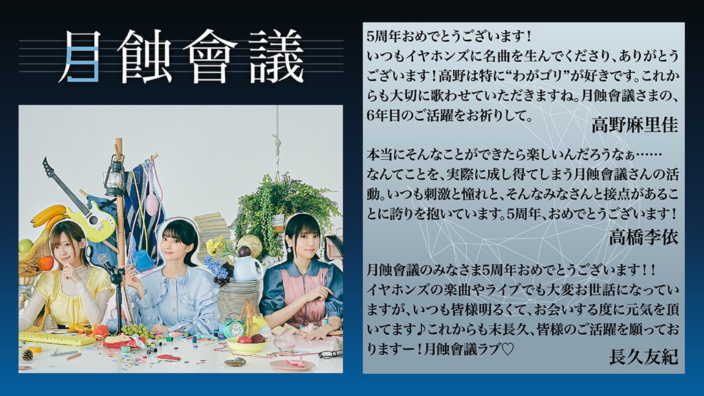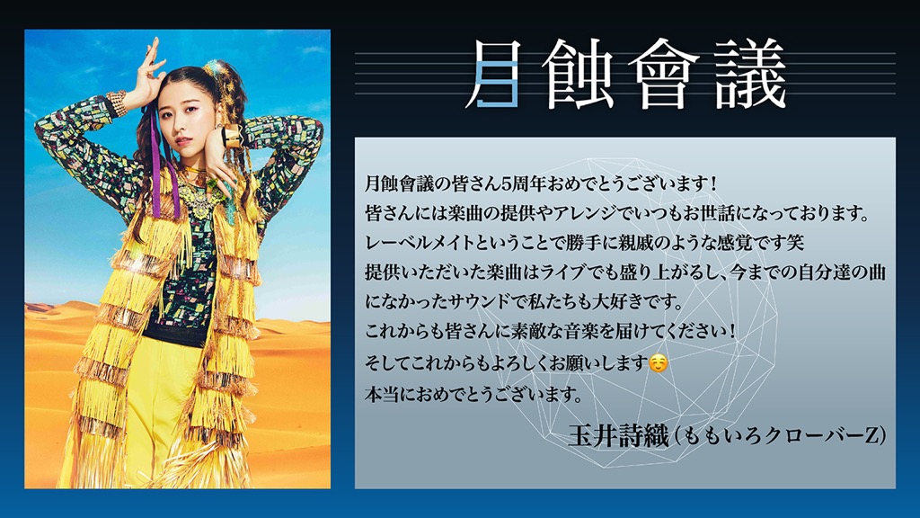 そして、結成5周年を迎える月蝕會議へと、5周年にちなんで5組のアーティストからお祝いコメントが寄せられた。