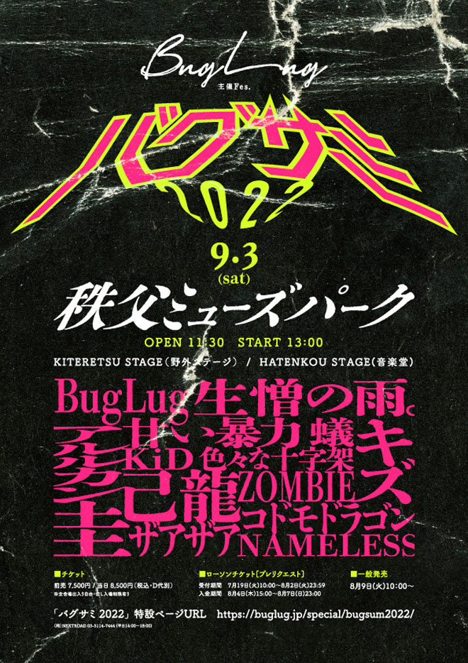 BugLugが毎年夏に主催しているヴィジュアル系フェス<バグサミ>。今年2022年はBugLug史上、初の主催野外フェスとして9月3日に埼玉県・秩父ミューズパークで開催される。