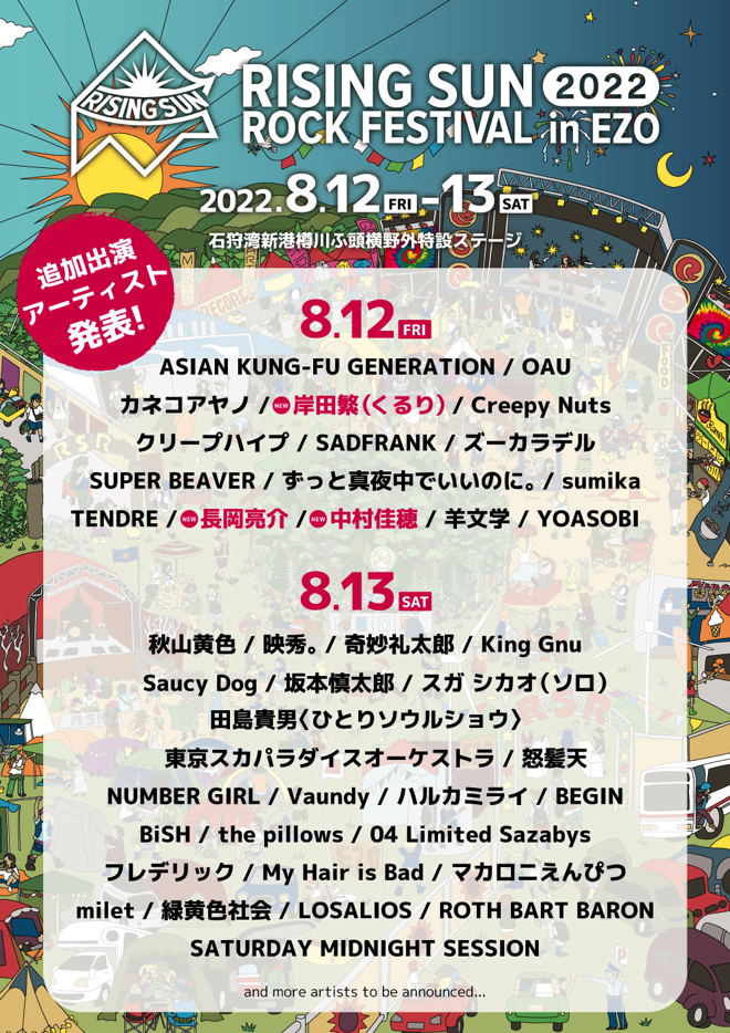 8月12日と13日に北海道・石狩湾新港樽川ふ頭横野外特設ステージで開催される<RISING SUN ROCK FESTIVAL 2022 in EZO>の出演アーティストの追加発表が行われた。