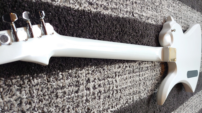 壁掛け時にネックでの吊り下げが不安定ですので、ヘッドにウォルナットで引っかかりを作った部分がお気に入りです。ボディは毛並みっぽい仕上がりを求め、塗装はパール系メタリックの白を粉っぽく吹いております。「輝くマット塗装」という謎単語が生まれました。こちらも大変満足のいく仕上がりで変な脳汁が…これが欠乏すると、また発症してしまうのでしょう。もう組み続けるしかない人生でございます。