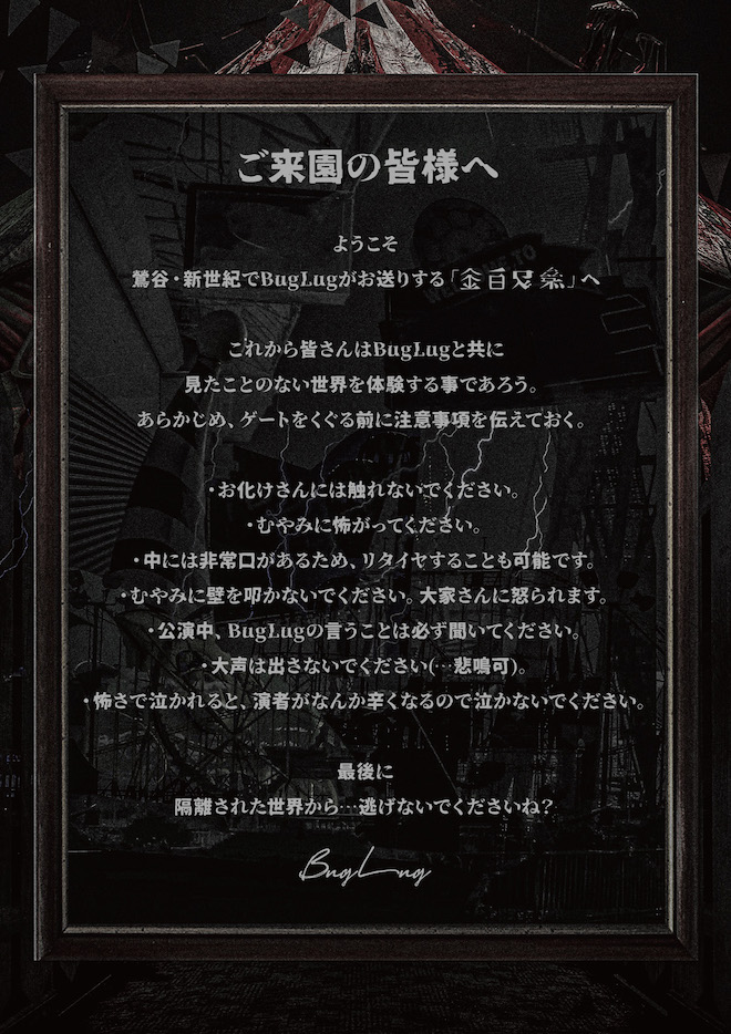 公開されたフライヤーは退廃的なサーカスをイメージさせるデザインとなっている。同時に「ご来演の皆様へ」と題された、まるでテーマパークのアトラクション説明文のような注意書きが公開されており、その文末は「隔離された世界から・・・逃げないで下さいね?」と締められている。