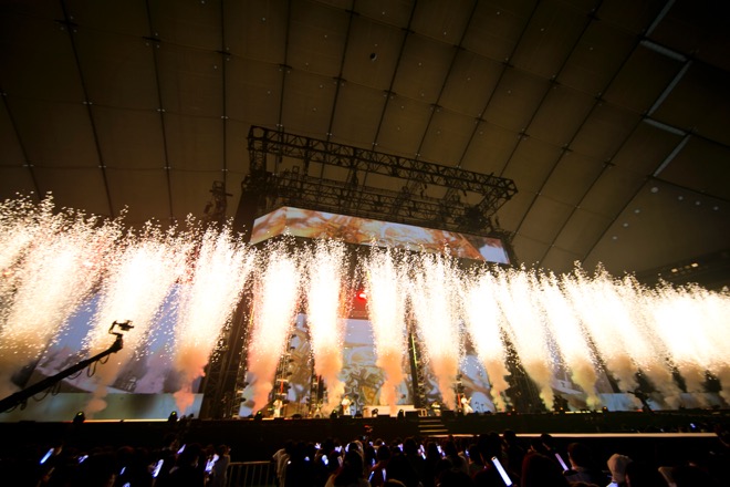 真っ白な衣装に身を包んで登場した1日目の幕開けは「神様の遺伝子」。巨大なLEDビジョンをバックに、レーザーが飛び交い、CO2ジェットがたちあがるド派手な演出と共に「輪廻転生」「ブレス」とハイテンションなナンバーを続ける。