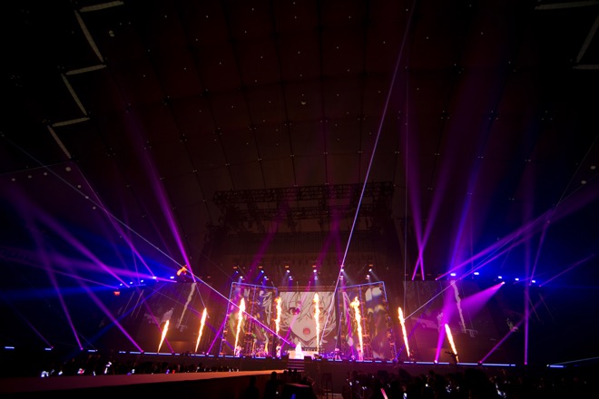 「みなさん、こんにちは! まふまふです! おーい、みんな見えてるか!?」とオーディエンスに声をかけ、ドームを埋め尽くすペンライトの光を見渡したまふまふ。続けて披露したのは、このライブのために書き下ろしたという新曲「エグゼキューション」だ。張り裂けそうな思いの伝わってくる歌声も、壮大な情景を描く曲の終わり方も、とても鮮烈に胸に迫る。