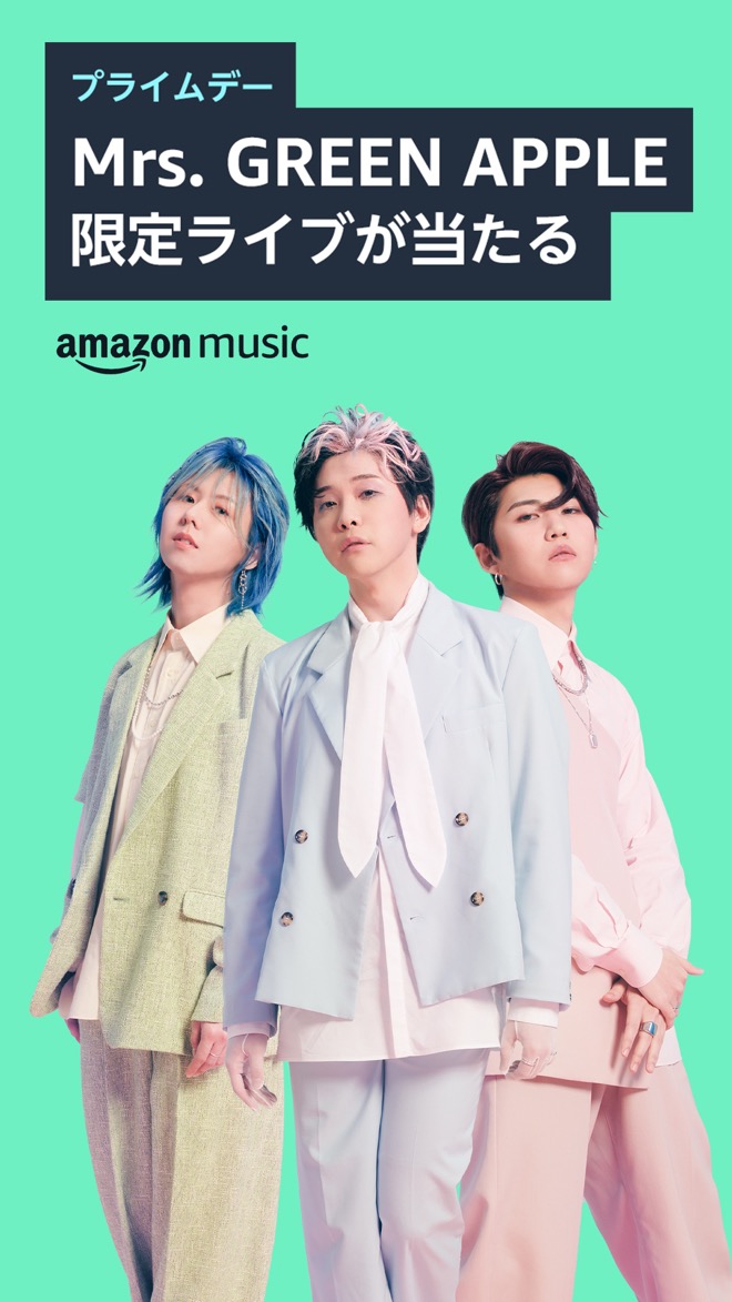 これは、Amazonプライムデーに際して実施されるスタンプラリーキャンペーンにて、7月11日までにAmazon Music PrimeでMrs. GREEN APPLEの楽曲を聴き、Musicのスタンプを獲得したプライム会員のなかから、抽選で250組500名を7月19日(火)に行われる<Mrs. GREEN APPLE プライム会員限定 特別ライブ>に招待するというもの。また、そのライブ開催へ向けて、演奏して欲しい楽曲のリクエストを受け付ける企画も始まる予定だ。