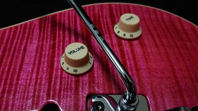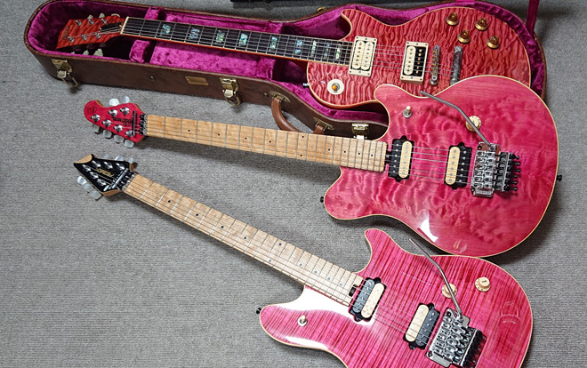 え?リフィニッシュとかアップリセス処理も自分でやったの?凄すぎないか。しかもこの色再現、完璧。でもトランスピンクに惚れる気持ちは痛いほどわかる。私もカワイイとカッコいいを両立した神がかった仕上がりと思い、探したことがあります。結局トランスパープルを手にするもその後壮大に色抜けするというトラップに引っかかりましたけど。それにしてもレスポールも凄くないか?マッチングヘッドだなんて。(JMN統括編集長 烏丸)