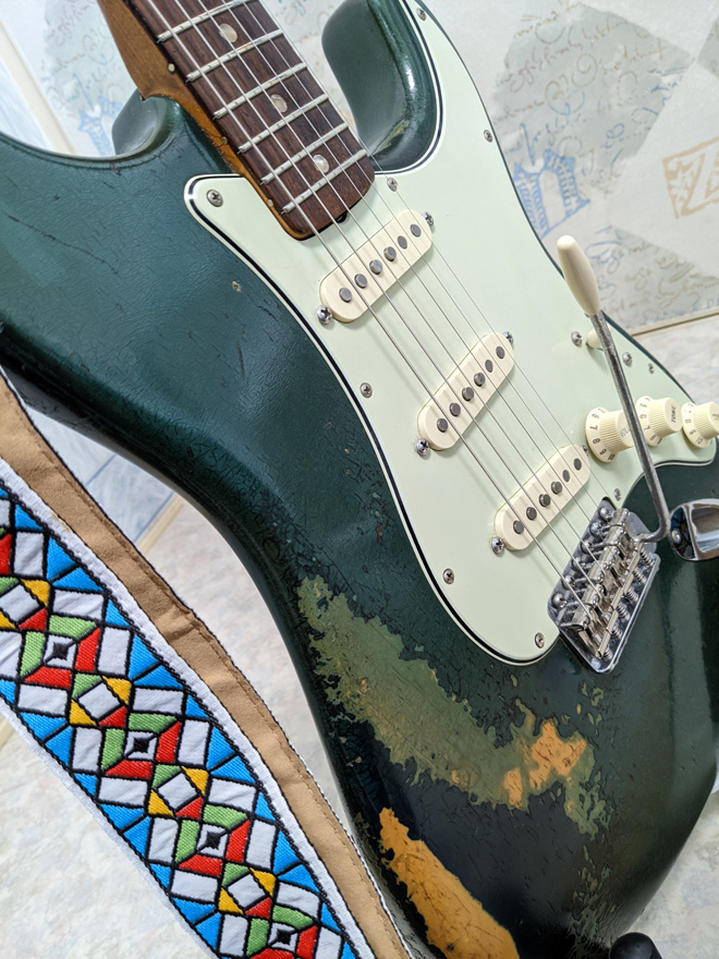 当時の人気機種はモズライトやジャガーなど、「誰がこんな変なギター弾いているの?」と探したものでしたが「音は抜群、弾きやすさもOK」で、あっという間にメイン・ギターとなりました。以降50年余、流石にフレット、ナットなどの消耗部品は幾度も交換。ボディの塗装ダメージもオーバーラッカーして保護。ネック裏のラッカー塗装は完全に剥がれていますが、かえって適度な滑りが出て演奏性は今も完璧。ピックアップはトモ藤田さんご愛用のGRINNING DOGさんにお願いした結果、ラージヘッド・グレーボビンのストラトの特徴である「高域特性に優れた涼しげな響き」を見事に引き継ぎ、私の拙い腕を半世紀を超えてカバーしてくれています。