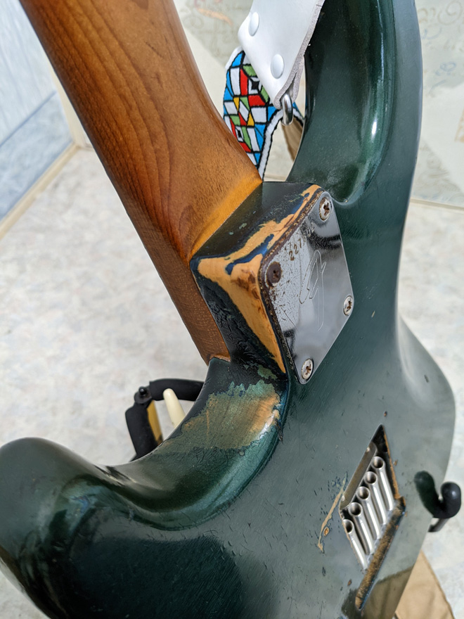 これまたレアで貴重なストラトのご登場です。ラージヘッドの4点留め、もちろんWITH SYNCHRONIZED TREMOLOロゴが光る。しかもレアカラー。これは激烈な経年変化を起こした末のレイクプラシッドブルーだと思うんですけど、違うのでしょうか。ジョイント部分にちょっぴり残っているカラーこそ、本来の色じゃないのかな。レスポールのゴールドトップ同様、ブラスパウダーが入っていた事による緑化と妄想。今もなお現役で一級のサウンドを放つストラトですが、座長さんの人生をそのまま映したいかのような貫禄が凄い。ラッカーを吹いたとのことですが、細かいウェザーチェックがびっしり一面に入り、それらがポロポロと剥がれ落ちることで塗装ハゲが起こり、天然レリックが育っていく様子が手に取るようにわかります。ギターの歴史の1ページを切り取るような貴重な1本ですね。(JMN統括編集長 烏丸)