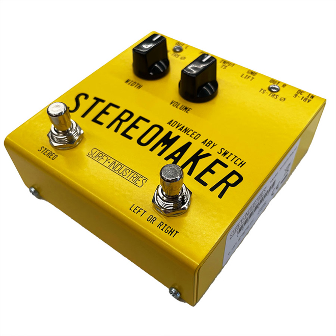 一方、Surfy Industries StereoMakerはステレオエフェクトや様々な機能を有するABYペダル。一般的なABYペダルは単純に入力ソースを2つに分岐させるだけだが、StereoMakerは完全にバッファリングされ、ソフトタッチJFETスイッチング、トランス絶縁出力、疑似ステレオエフェクト、180度の位相反転、グラウンドリフトなどの機能を搭載。ステレオモードではステレオワイズ(幅)と音量のコントロールを有効にして疑似ステレオサウンドを得ることができる。PADスイッチを使用するとラインレベルの信号をインストルメントレベルまで減衰させることが可能。また、StereoMakerはアンバランス信号をバランス信号に変換するためのダイレクトボックスとして使用でき、キーボードプレーヤーやレコーディングスタジオにとっても便利なツールになるだろう。
