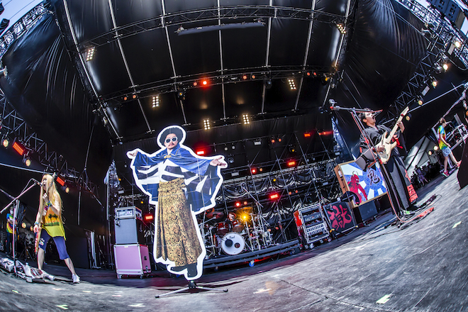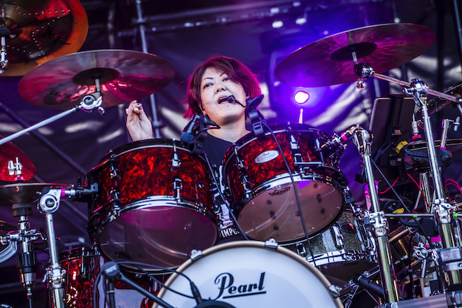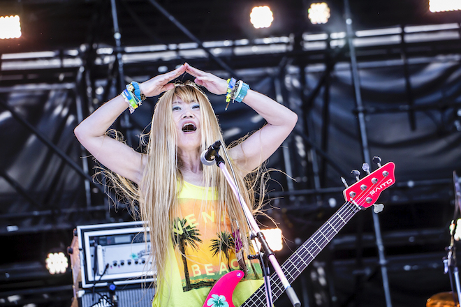 そしてここからは、灼熱をもろともせず、それどころか気温を何度も上げるようなアグレッシヴでな定番曲を連投する。河本が力強い2ビートを腹に響かせ、junkoはステージ前方でダイナミックにロングヘアを揺らしプレイする「きのこたけのこ戦争」。