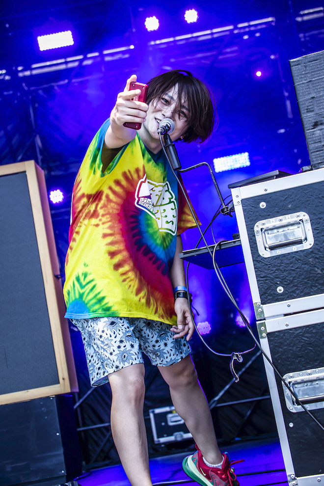 そして中盤は、コロナ禍で何もできない、どこにも行けない憂いを込め、またそれを痛快に吹き飛ばすようなミクスチャーサウンドで、「地味な生活」を披露。そしてまさにこの暑さにぴったりな「なつのうた」を続ける。清涼感のあるブリージーなボサノバ風のギターフレーズから、一転して“あつい”“やばい”とデスボイスを繰り広げるギャップチューン、今最もリアルなあるあるチューンに、オーディエンスの腕もいちだんと高く掲げられた。