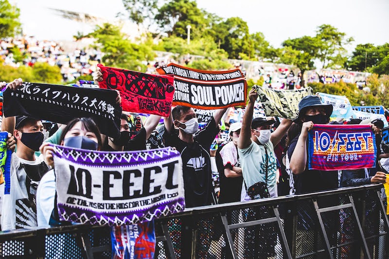 いよいよ10-FEETの登場。SEが流れると同時に、オーディエンスは一斉に高くタオルを掲げ、会場はフェスのものからさまざまなバンドのものまで、カラフルなタオルで埋め尽くされ、3人が登場するとそれが大きな手拍子に変わっていく。