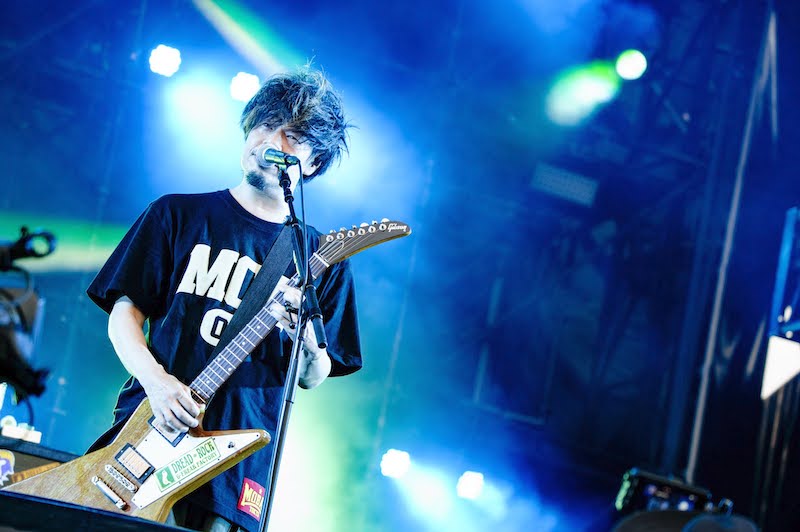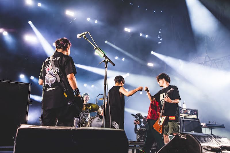 「よっしゃいくで」とつぶやくTAKUMA(Vo,G)の横で、NAOKI(B,Vo)は天を指差し、勢いよくスタートした曲は「super stomper」。シャープでいて、柔らかくしなるような柔軟性もあるビートに、会場が跳ねる。続いて、「ハローフィクサー」「VIBES BY VIBES」へと突入していくのだが、今日の10-FEETのアンサンブルはどっしりとしていて、いろんなものを大らかに受け止めていくような大きさを感じる。朝からたくさんのバンドで繋いできたステージ、そのアグレッシヴさも狂騒も飲み込んで、軽やかに解き放つ。主催としての貫禄や懐の深さがその演奏のいい余韻となっているようだ。