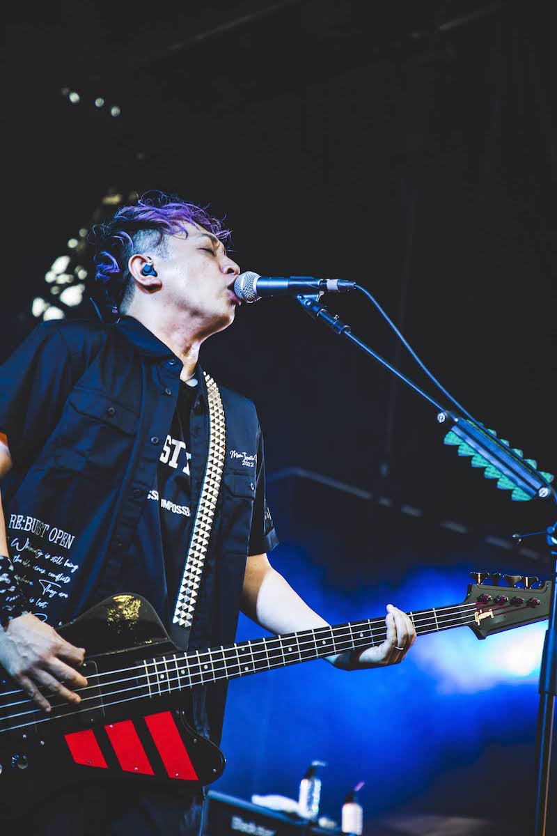 そこから繋いだ「シエラのように」は、夕方の風と混じり合ってセンチメンタルに響いた。そんなエモさ爆発な序盤の空気をガラリと変えたのは、6月にリリースした新曲「aRIVAL」。シャウトとヘヴィなリフによるラウドサウンドから、サビでNAOKIのハイトーンが冴えるコントラスト抜群の曲で、これからのライブでもカンフル剤的な曲になっていきそうだ。