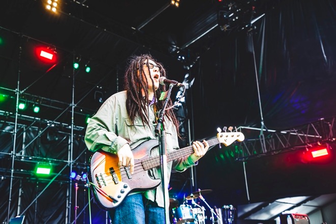 そんな彼らが選んだ1曲目は、G-FREAK FACTORYの曲の中でも攻撃的な顔つきの「SOMATO」。原田季征(G)の弾く勢いあるリフ、吉橋“yossy”伸之(B)と渡部“PxOxN”寛之(Dr)が生むえげつないほどグルーヴするリズムに乗り、オーディエンスと笑顔でコンタクトしながら歌う茂木。琴の音色を合図に突入した「REAL SIGN」では、自然にハンドクラップも起こり、G-FREAK FACTORYとひとつになっていくオーディエンス。そんな光景を、レゲエカラーのグリーンとレッドに点滅する照明が鮮やかに彩っていった。