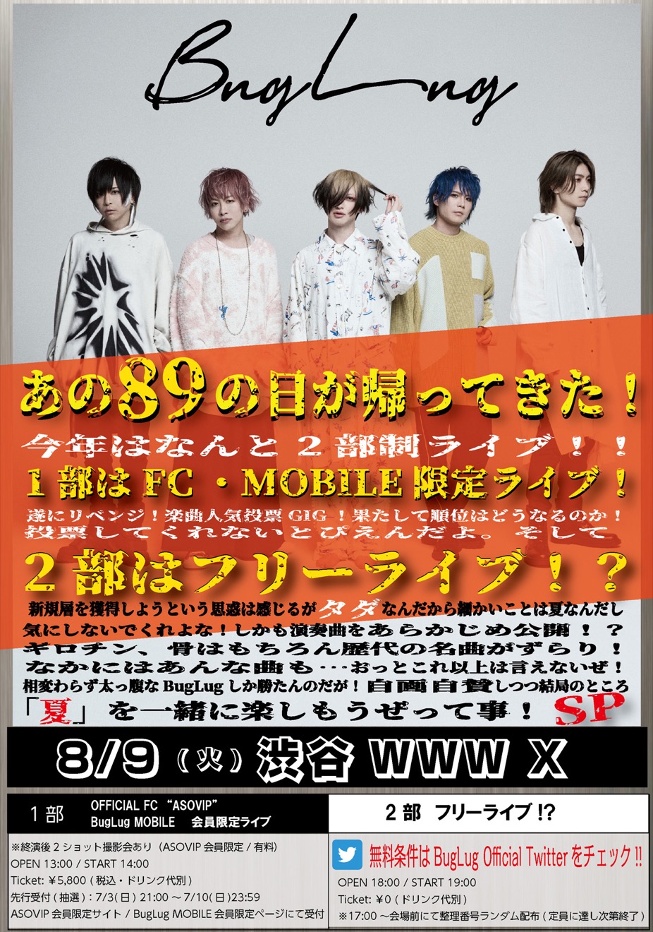 <あの89の日が帰ってきた!今年はなんと2部制ライブ!!1部はFC ・モバイル限定ライブ!遂にリベンジ!楽曲人気投票GIG!果たして順位はどうなるのか!投票してくれないとぴえんだよ。そして2部はフリーライブ!?新規層を獲得しようという思惑は感じるがタダなんだから細かいことは夏なんだし気にしないでくれよな!しかも演奏曲をあらかじめ公開!?ギロチン、骨はもちろん歴代の名曲がずらり!なかにはあんな曲も…おっとこれ以上は言えないぜ!相変わらず太っ腹なBugLugしか勝たんのだが!自画自賛しつつ結局のところ「夏」を一緒に楽しもうぜって事!SP>