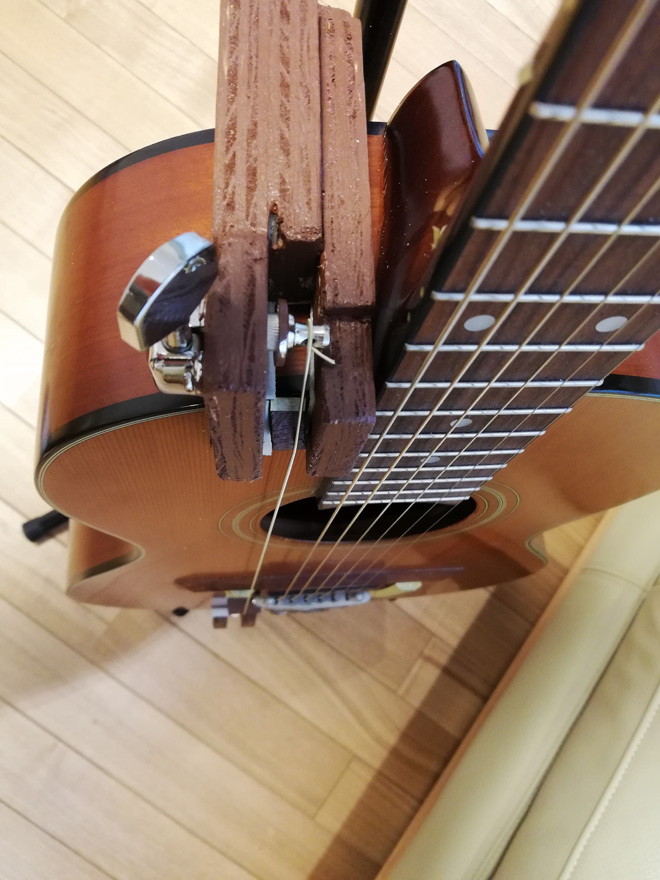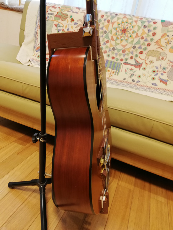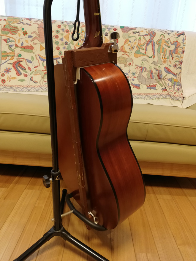 フィンガー・ピッキングで親指でベースを弾いていると、どうも開放弦が1本足りない。と云って7弦ギターではネックが太すぎて、ナッシュヴィル・グリップが出来ない。ハープ・ギターでは大げさすぎる。それでは、と云うことでボディに弦を張ることにしました。拾ったべニア板で作った前後のコの字型のクランプ2個だけではボディ表板が耐えられそうにないので、裏側にストラットを付けて継ぐことにしました。