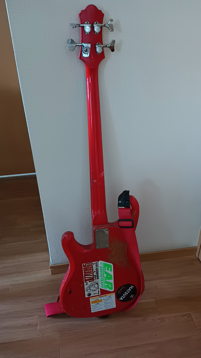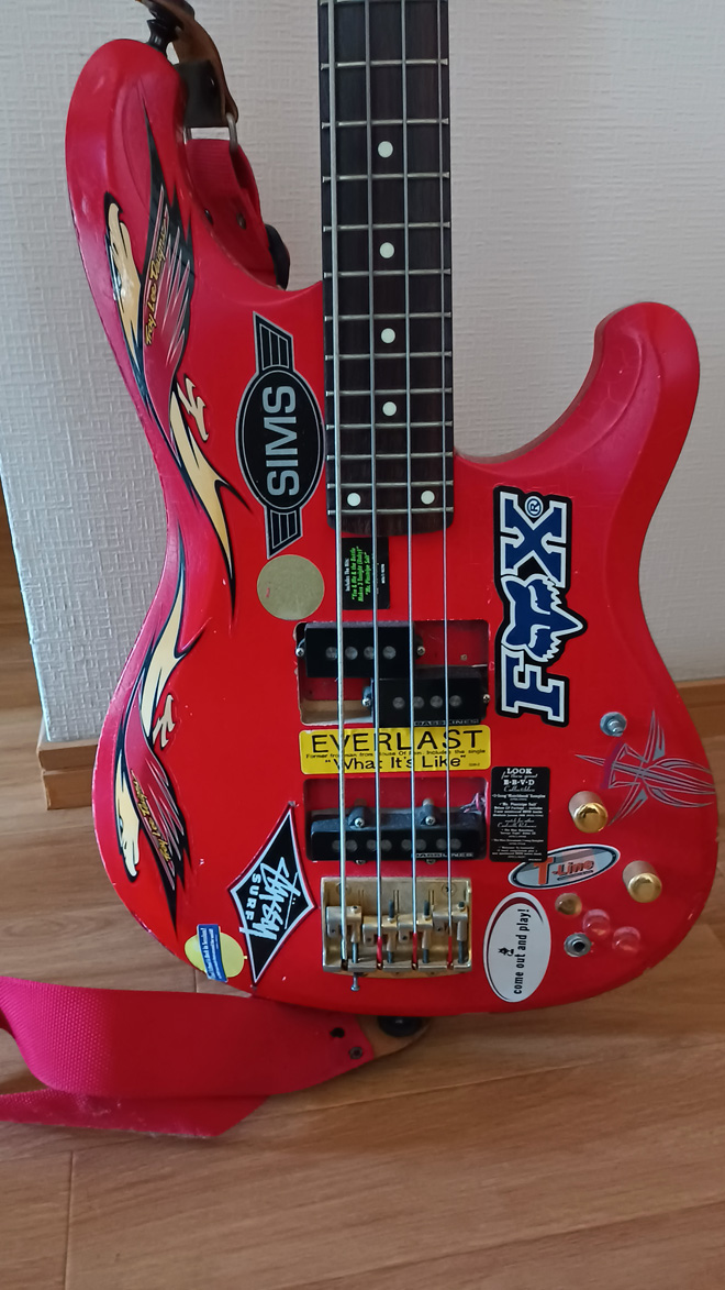 それからよせばいいのにボディをピンクに塗装、ステッカーチューンを施し数年。ピンクが飽きたので今度は赤に。音が物足りないとダンカンのPJボディざぐりで挿入。いろんなステッカーも足されて行きました。20年ほど経った時にライブで演奏中に弦切れ、ちょっと苛ついた私はベースを投げ捨ててしまいました。するとその拍子に1弦ペグがポッキリ!その当時RB550のペグを探しても売ってません、楽器やさんでも手に入らない、もう後悔先に立たず。ネックから変えてしまおうかとも悩みましたが、1年後執念でグレコで同じ直径のペグを探し出しました。なので1弦だけペグが違いますがご愛嬌。何でしょう、この立ち姿、若気の至りとはこのことですね。最近まで現役でした。