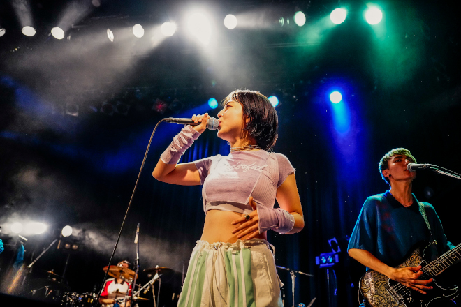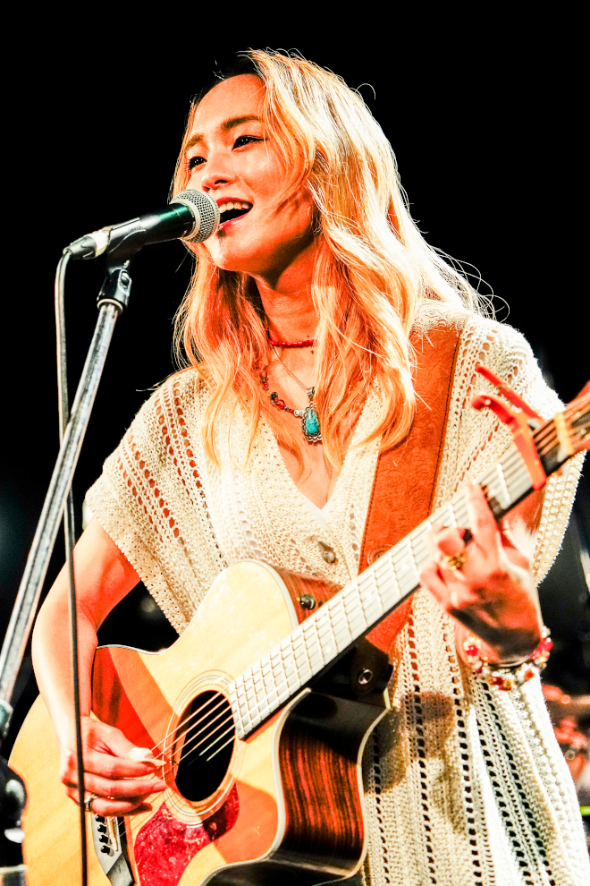 「北の大地が産んだスーパー天然サンシャインガール」と呼び込まれたのはRihwa。「国境とか関係なくて、いろんなものを超えていけることを証明したくて音楽をやってるんですよ!」と快活な声で客席に挨拶をすると、「北海道出身の私だからできた曲」と演奏されたのは「MARIMO」。北海道・阿寒湖に生息しているマリモについての歌なのだが、なぜかサウンドはラテンフレーバー全開というかなり独創的なこの曲は、Rihwaがライヴで弾き語っているのを観て、「この曲をやりたい!」とEOWサイドからオファーしたそう。情熱的なリズムを乗りこなすパワフルな歌声と、客席に高速手拍子を促す天真爛漫なキャラクターで、オーディエンスの心を鷲掴みにしていた。そんな彼女に対して、Lacoは「Rihwaちゃんほど瞳が綺麗な人を知らない」とコメント。Rihwaは「Lacoちゃんと絶対に歌いたいと思っていた」と、2人で「春風」を歌うことに。先ほどまでのアッパーな空気とは打って変わって、柔らかなスロウナンバーで客席を包み込んでいた。