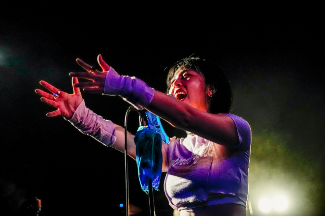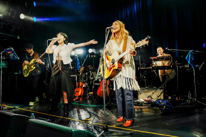 「ヤバい夜が始まってしまいましたね」と切り出したのは、2番手に登場したLeola。彼女はまず、「EOWのみんなが好きだと言ってくれた」という「ないものねだり」を披露。マイクスタンドを握りしめ、やりきれなさやもどかしさを爆発させるように、切なさに満ちたメロディを響かせていく。曲を終えた後、「今まで観たLeolaの中で一番よかった!」とLacoが太鼓判を押すと、「EOWのためと思ったら気持ちが込めれた」とLeolaが返す。2人は出会ってから8年来の付き合いで、「ガチの友達」なこともあり、ステージでの共演にかなり感慨深そうにしている。そして、「Leolaと一緒に歌わせてもらうんやったら、私達が大好きな曲を」と「Let it fly」へ。穏やかな始まりから徐々にビートが力強くなっていき、瑞々しいバンドサウンドが弾けると、伸び伸びと歌う2人の声が絡まり合う。さすがガチ友なだけあって、息もぴったり。美しいハーモニーを客席に届けると、「エモ死にするかと思った……!」とLacoは喜んでいた。